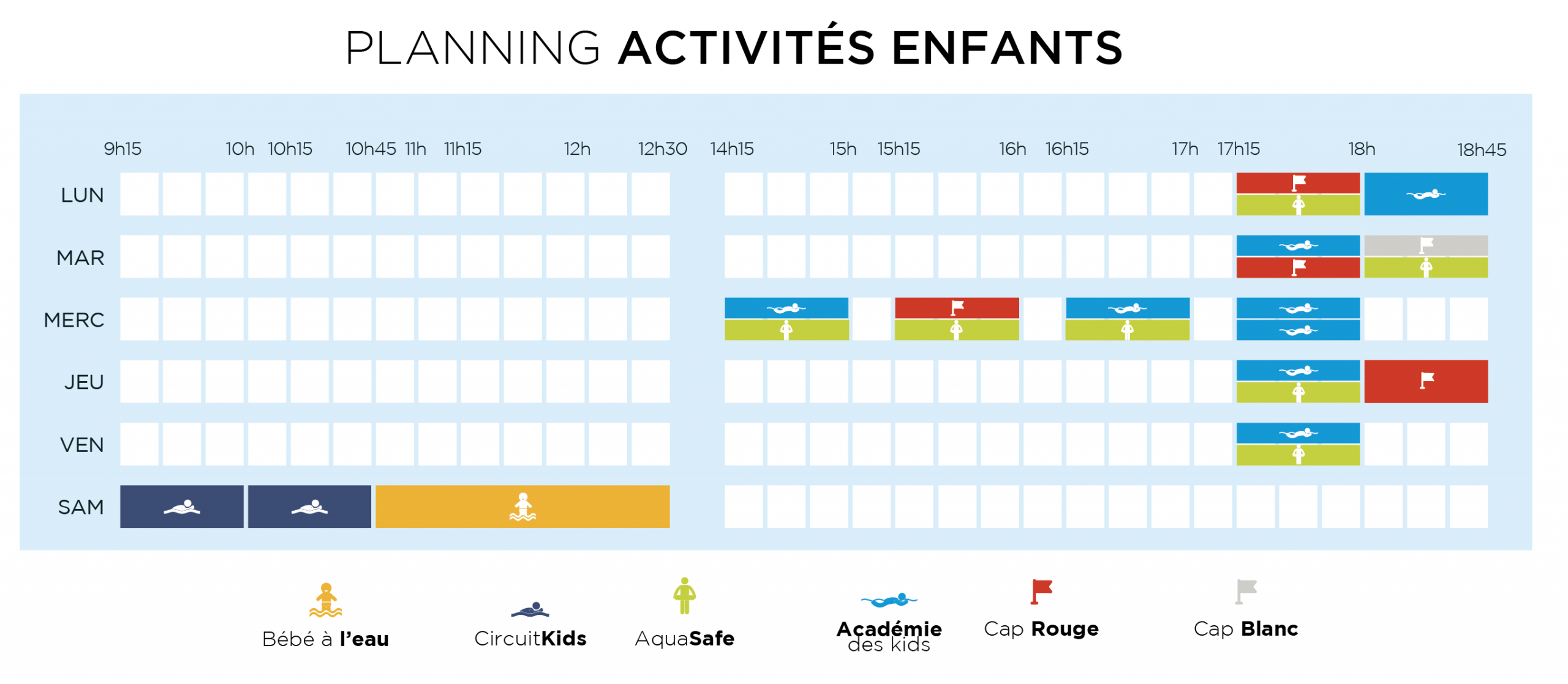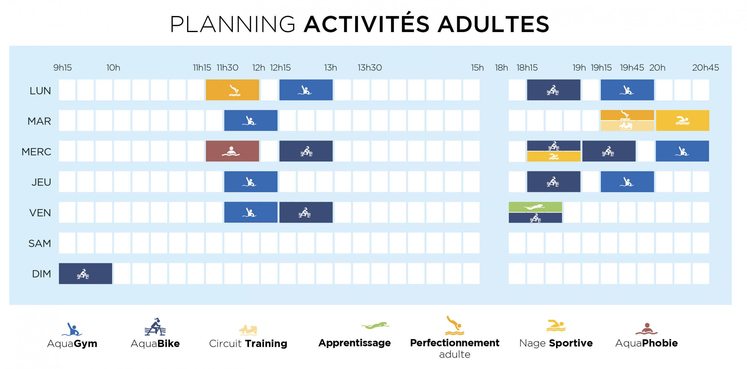 PLANNING ACTIVITÉS ACTIVITÉS ADULTES AQUAGYM AQUABIKE CIRCUIT TRAINING APPRENTISSAGE PERFECTIONNEMENT AQUAPHOBIE RETRAITE SPORTIVE NAGE SPORTIVE ACTIVITÉS ENFANTS BB & Cie CIRCUIT KIDS AQUASAFE ACADÉMIE DES KIDS CAP ROUGE CAP BLANC